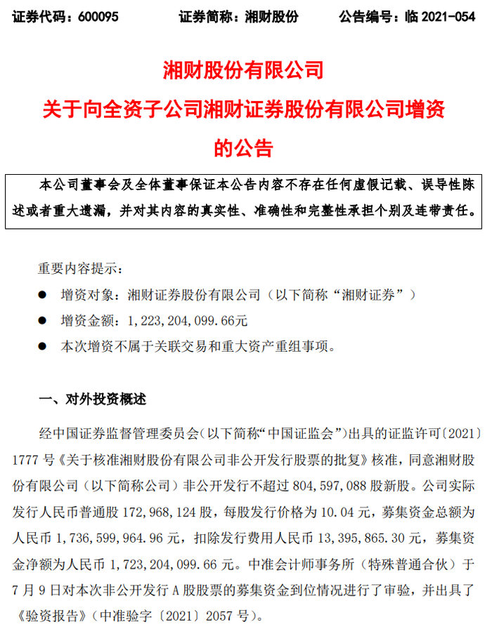 7月9日,湘财股份公告进展,该公司实际发行普通股约1.73亿股,每股发行价格为10.04元,募集资金总额为17.37亿元,扣除发行费用后,募集资金净额为17.23亿元。