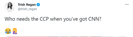 本来就因为支持前总统特朗普,而和CNN等媒体不对付的福克斯新闻前主播特丽什·里根,自然要抓住这个“落井下石”的机会。在个人网站刊文,从Ben同志文章的字里行间找到了他“反华不绝对”的话,以“爱国”为名大搞“文字狱”。还在推特上嘲讽“有了CNN,中共都不用出马了”。
