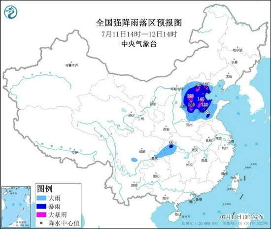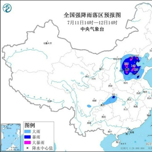 预计7月11日14时至12日14时 ,山西中东部、河北、北京、天津 、山东中西部和半岛东部、河南中北部和东部等地的部分地区将有8-10级雷暴大风或冰雹天气,局地雷暴大风超过11级 ;内蒙古中南部、辽宁西部、陕西中南部、山西、河北、北京、天津 、山东、河南中北部、湖北西部、四川东北部和南部、重庆、广西东南部沿海等地的部分地区将有短时强降水天气,小时雨量30-60毫米,局地可达80毫米以上。