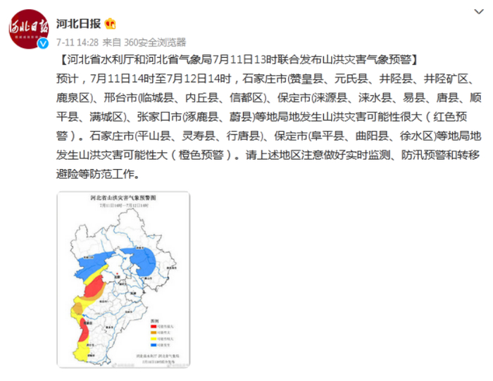 预计,7月11日14时至7月12日14时,石家庄市(赞皇县、元氏县、井陉县、井陉矿区、鹿泉区)、邢台市(临城县、内丘县、信都区)、保定市(涞源县、涞水县、易县、唐县、顺平县、满城区)、张家口市(涿鹿县、蔚县)等地局地发生山洪灾害可能性很大(红色预警)。石家庄市(平山县、灵寿县、行唐县)、保定市(阜平县、曲阳县、徐水区)等地局地发生山洪灾害可能性大(橙色预警)。请上述地区注意做好实时监测、防汛预警和转移避险等防范工作。