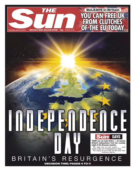 脱欧公投当天,《太阳报》头版标题就是“独立日:英国复兴”。