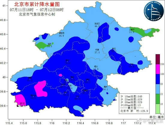 截至12日09时,全市平均降雨量65.9毫米,城区平均79.9毫米,西南88.5毫米,西北58.0毫米,东南57.7毫米,东北47.2毫米;城区最大海淀翠湖湿地109.7毫米,全市最大房山南窖143.3毫米。房山、门头沟、昌平、海淀、石景山、延庆、怀柔出现6级以上大风,阵风9级左右。