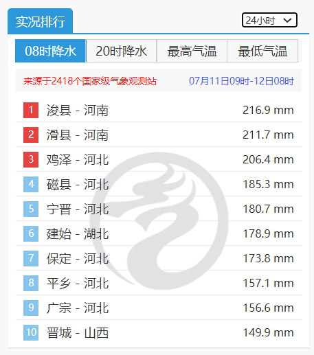11日06时至12日06时,安阳、鹤壁、济源局地出现特大暴雨,濮阳、新乡、焦作局地出现大暴雨,三门峡、洛阳、郑州、南阳局地出现暴雨,有439个雨量站降水量超过50毫米,其中大于100毫米的有200个,大于250毫米的有6个。最大降水量出现在济源水洪池322.3毫米。