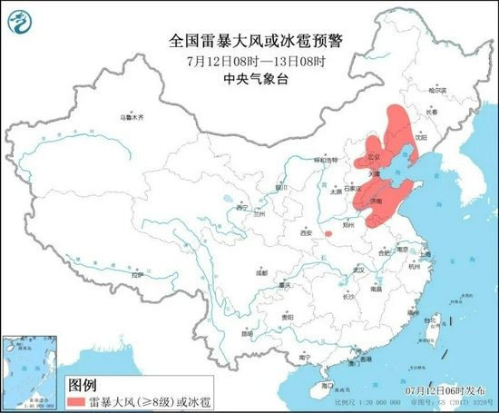预计7月12日08时至13日08时,内蒙古中东部、黑龙江西部、辽宁南部和西部、河北、北京、天津、山东、河南南部和西部、安徽北部、江苏北部、湖北南部、湖南北部、四川南部、重庆中西部、贵州北部、云南西南部、广西东南部沿海等地的部分地区将有短时强降水天气,小时雨量30-60毫米,局地可达80毫米以上;内蒙古东南部、辽宁中西部和南部、河北北部、北京、天津、山东、河南北部和东部、江苏北部等地的部分地区将有8-10级雷暴大风或冰雹天气, 局地风力可达11级以上。