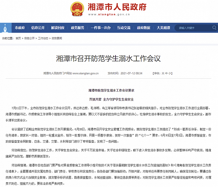 原标题:溺水事故致5人遇难,湘潭:对防范学生溺水工作要严格督促检查和考核问责