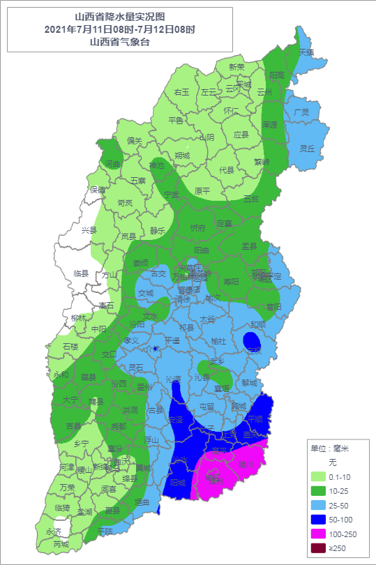 7月11日08时至7月12日08时,山西省出现大范围较强降雨天气,全省降水量在0.3~161.4毫米之间,晋城泽州最大。其中,泽州、晋城城区和陵川在100毫米以上;高平、平顺、阳城、壶关、沁水、左权、安泽、沁源、介休共9个县(市、区)降水量在50~100毫米之间;小店、灵石、祁县、上党、广灵等27个县(市、区)降水量在25~50毫米之间;娄烦、襄垣、汾阳、垣曲、尧都、交口、隰县等36个县(市、区)降水量在10~25毫米之间。晋城城区、高平、沁水、阳城、陵川和泽州出现≥20毫米/小时的短时强降水。