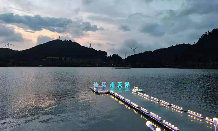 夜色降临,波光粼粼的湖面,梦幻迷离的炫彩灯光,映衬这“诗话南天湖”几个大字,给这场活动烘托了文化浪漫的气氛。