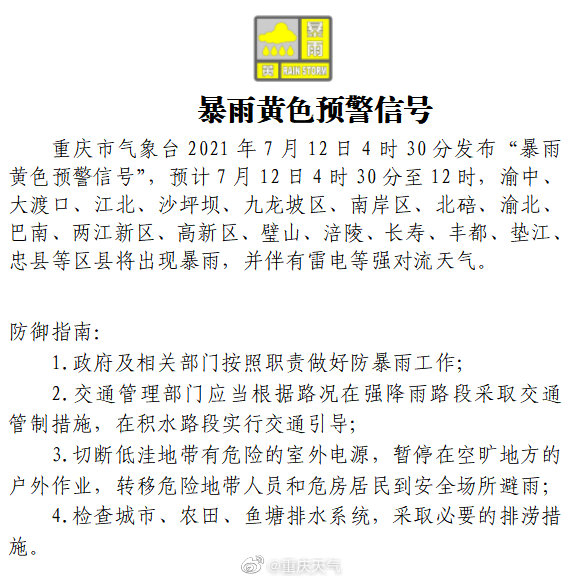 重庆市气象台2021年7月12日4时30分发布“暴雨黄色预警信号”,预计7月12日4时30分至12时,渝中、大渡口、江北、沙坪坝、九龙坡区、南岸区、北碚、渝北、巴南、两江新区、高新区、璧山、涪陵、长寿、丰都、垫江、忠县等区县将出现暴雨,并伴有雷电等强对流天气。