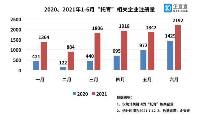 2020年,在疫情的影响下,托育相关企业注册量仍然创造了历史新高,并且增速惊人。而2021年上半年更是延续了这一增长趋势,今年1-6月新增托育相关企业1万多家。按月度来看,今年以来各月份注册量均远高于去年同期。近两年的持续走高,是否可从一定角度判断行业即将迎来爆发?