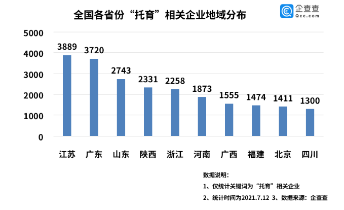 暑期来临,为满足广大家长需求、解决学生暑期“看护难”问题,日前教育部印发了《关于支持探索开展暑期托管服务的通知》,引导支持有条件的地方积极探索开展暑期托管服务工作。目前,我国托育行业的环境如何?企查查数据显示,目前我国现存“托育”相关企业3.3万家,其中2020年新增1.2万家,同比增长237%;今年上半年新增1万多家。从地域分布来看,江苏省以3800余家企业排名第一,广东、山东分列二三位。随着社会经济条件越来越好,未来托育行业的需求还会水涨船高。
