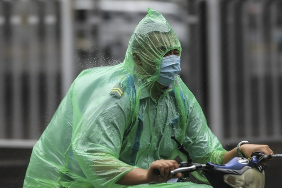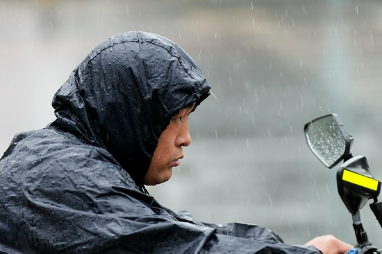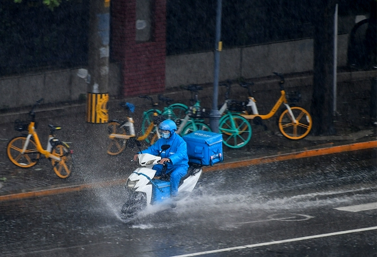7月12日,北京,市民在大雨中骑行,瓢泼大雨让人睁不开眼。