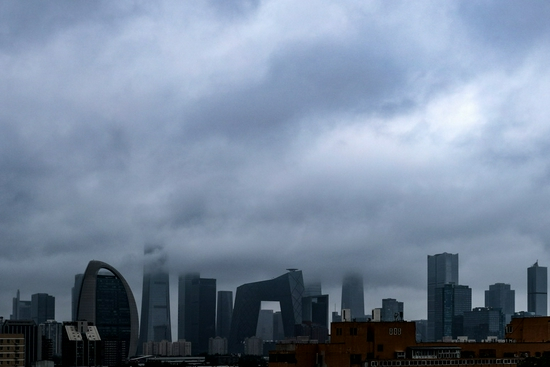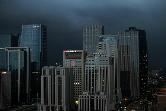 7月11日傍晚,大雨来临前,北京中心城区上空乌云密布。