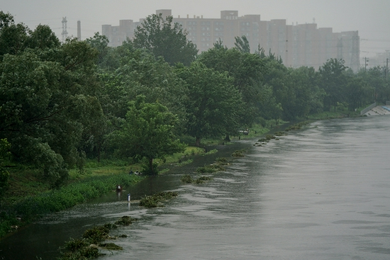 7月12日,在北京市大兴区亦庄镇凉水河畔,河水漫上河两侧的步道。