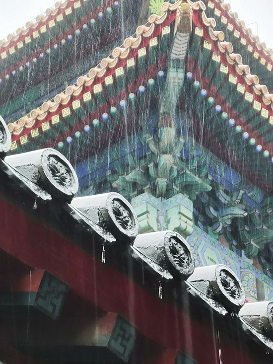 7月12日,北京,暴雨来袭,故宫屋檐流下的水滴如线。