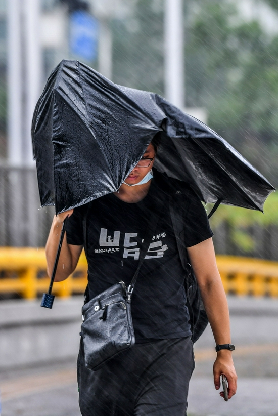 7月12日,北京,持续大雨伴随着大风,行人的雨伞已被风吹烂。