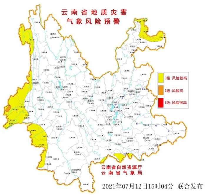 2021年7月12日20:00~7月13日20:00,滇西德宏州局部发生滑坡泥石流的风险高;滇西北怒江州大部,滇西德宏州大部,滇西南临沧市西部、普洱市局部,滇南红河州局部,滇东北昭通北部发生滑坡泥石流的风险较高。