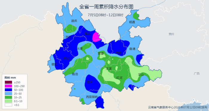 7月12日20时—7月13日20时:怒江北部、保山西部、德宏、临沧西部阴有中雨局部大雨,曲靖南部、昆明南部、楚雄南部、玉溪、红河北部、文山北部多云间晴,其他地区多云有阵雨局部中雨。