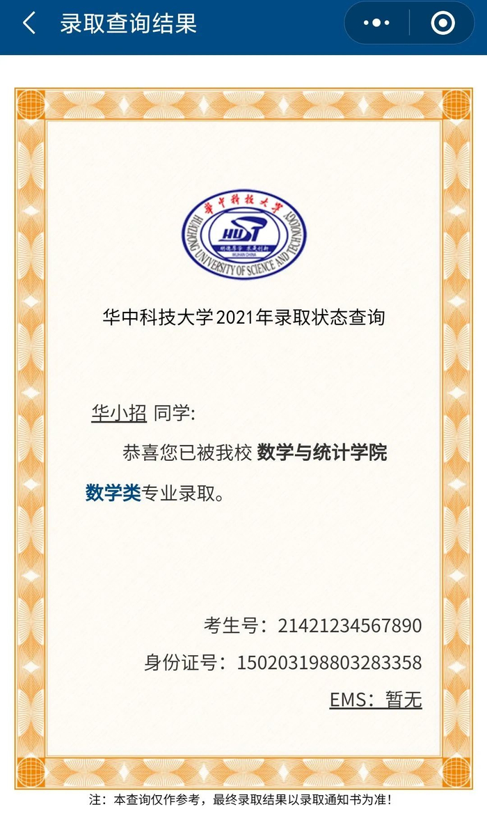 (小程序查询录取结果展示图)