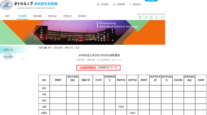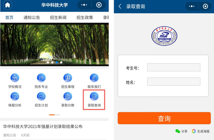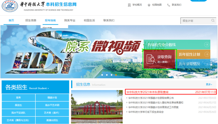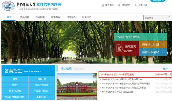 (2)点击“通知公告”栏中“华中科技大学2021年本科录取查询”,或直接点击网站首页“录取查询”进入查询页面,