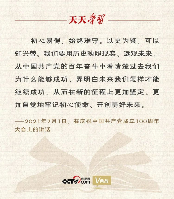 以史为鉴,可以知兴替。在庆祝中国共产党成立100周年大会上,习近平总书记发表重要讲话,九次强调“以史为鉴、开创未来”,指出“我们要用历史映照现实、远观未来,从中国共产党的百年奋斗中看清楚过去我们为什么能够成功、弄明白未来我们怎样才能继续成功,从而在新的征程上更加坚定、更加自觉地牢记初心使命、开创美好未来”。