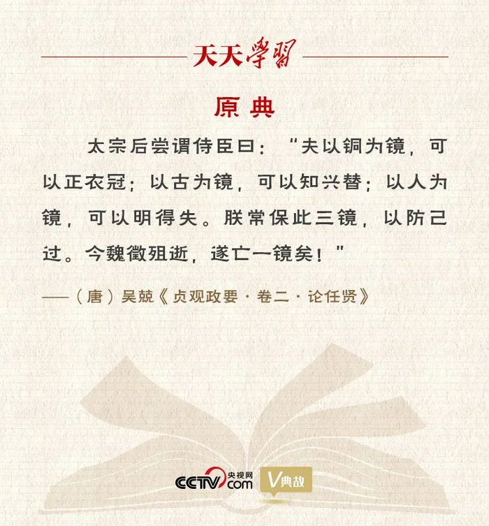 对于唐太宗的“镜子论”,白居易在《百炼镜》诗中赞曰:“太宗常以人为镜,鉴古鉴今不鉴容。四海安危居掌内,百王治乱悬心中。乃知天子别有镜,不是扬州百炼铜。”