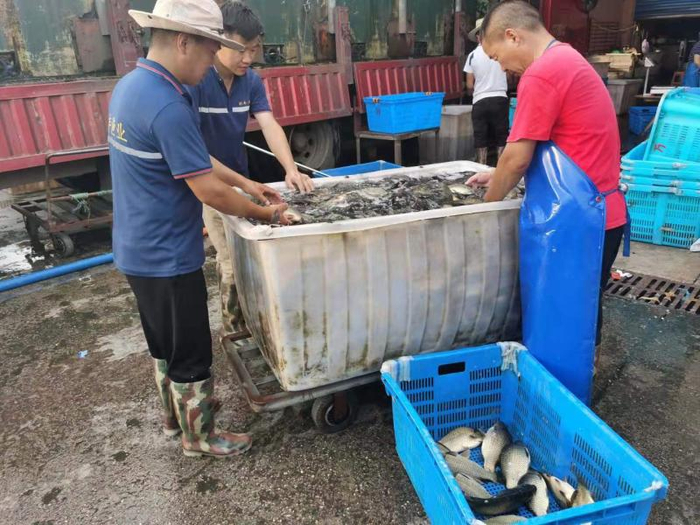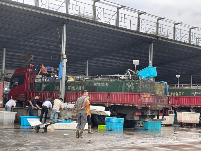 嘉燕市场的广场商铺前停满各式暗红色大渔车。套上长筒雨靴的小工爬上车,娴熟地抄起鱼网,将活蹦乱跳的鱼,从这一车“抄”到了那一车。渔车旁的店铺门口,大盆小盆也满是扑腾的鱼,黑鱼、鲫鱼、草鱼、花鲢鱼……一群人正埋头挑鱼。