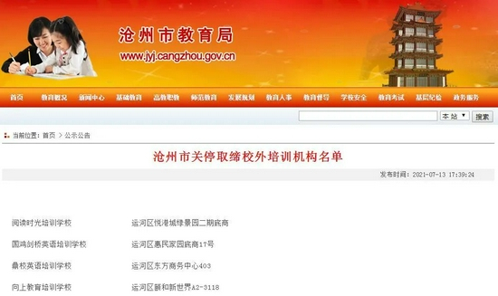 7月13日,沧州市教育局发布了《沧州市关停取缔校外培训机构名单》的公告,该名单涉及88所培训机构。