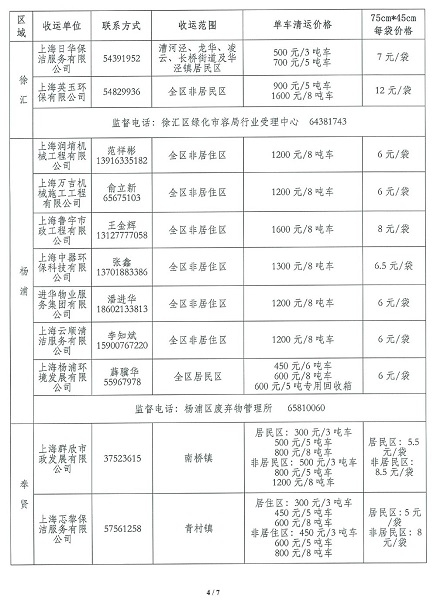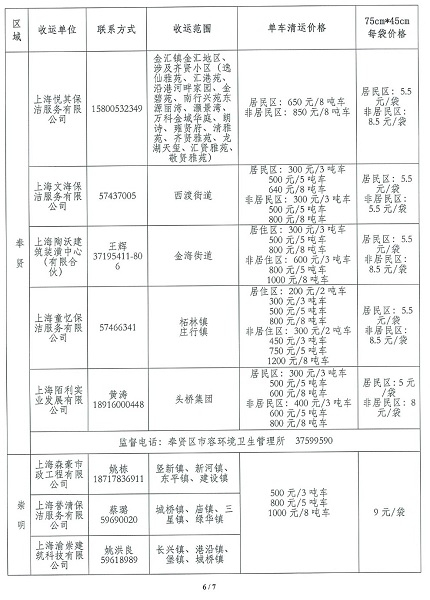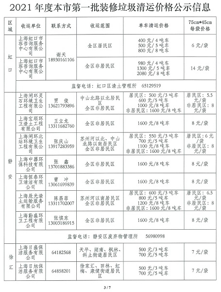 今天,记者在上海市市容环境卫生行业协会官网上发现,本市2021年第一批装修垃圾清运价格公示信息已发布,包括虹口、静安、徐汇、杨浦、奉贤、崇明六区,内含收运单位、联系方式、收运范围、单车清运价格、每袋价格等信息。