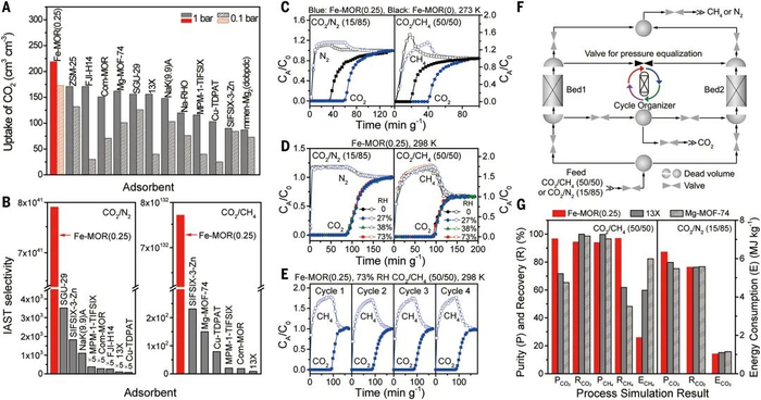 上图为气体吸附分离性能:(A) 298 K时CO2体积吸收量;(B) CO2/N2:15/85和CO2/CH4:50/50 二元混合物在1 bar和298 K下的CO2/N2和CO2/CH4分离选择性;(C-E) CO2/N2(CH4)穿透曲线;(F) 2-床VSA工艺的流程示意图和(G) ASPEN模拟结果。