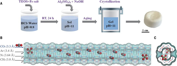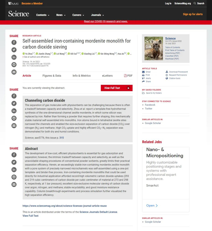 2021年7月16日,《Science》杂志全文在线发表了我校材料化学工程国家重点实验室、化工学院王军教授课题组在沸石分子筛碳捕集领域取得的最新研究成果“Self-assembled iron-containing mordenite monolith for carbon dioxide sieving” (自成型含铁丝光沸石整体性高效捕集二氧化碳)。