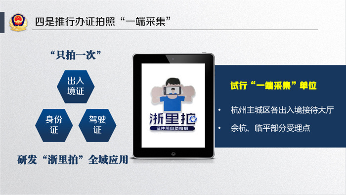 近年来,全省公安出入境管理部门针对内地居民,致力打造一个群众身边的出入境办证服务圈、实现出入境三大证全省任一窗口“全国通办”、开通了一条服务热线(即12367热线服务平台浙江出入境分中心)、推行办证拍照“一端采集”的“浙里拍”全域应用,为群众节约了大量时间和费用。