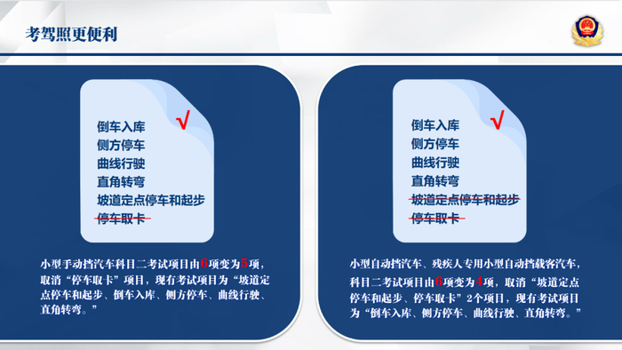 根据公安部统一部署,浙江还推进落实“我为群众办实事”公安交管12项便利措施。以驾驶证考试为例,浙江进一步精简考试项目,小型自动挡汽车、残疾人专用小型自动挡载客汽车科目二考试项目由6项减为4项,取消“坡道定点停车和起步”、“停车取卡”两个项目,手动挡汽车科目二考试项目由6项减为5项,取消“停车取卡”项目,每年将惠及超100万群众。