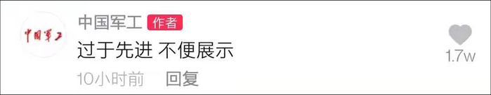 对此,“中国军工”在评论区直接了当,八字回应:“过于先进,不便展示。”