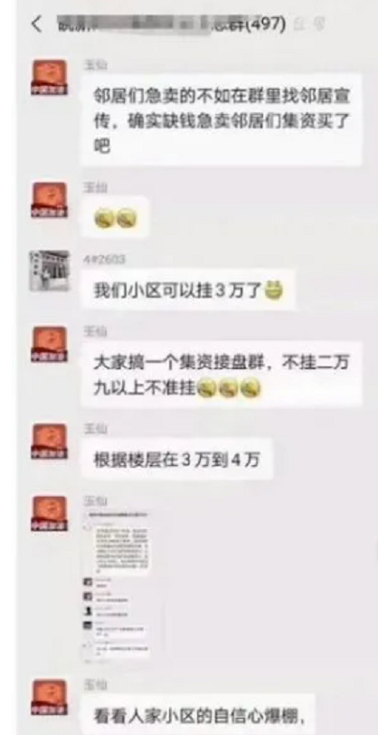以深圳为例,一些小区业主甚至祭出“资产保卫战”的大旗,倡议小区上下“拧成一股绳”,把房价硬生生“拉”上去,还有人写出“涨价檄文”,对降价业主进行声讨,勒令其提高价格,保护集体权益等等。