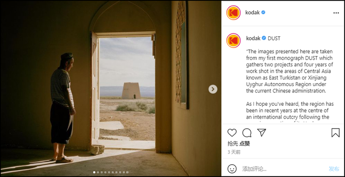 7月15日,柯达官方Instagram账号发布了摄影师帕特里克·瓦克(Patrick Wack)的新疆摄影作品,以及这位在中国生活过10多年的法国人写的“带货文案”。瓦克关于新疆的摄影集将于10月发布,柯达也为其贴上了预购链接。