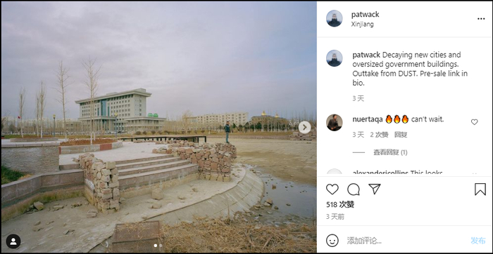瓦克15日通过他的个人Instagram账号,分享了即将发售的影集里的一些照片,立场更加鲜明。他从一个少见的角度拍下一幢建筑,并配文“衰朽的新城和过于庞大的政府大楼”,并提醒粉丝“新作品集的预售链接在个人简介里”。
