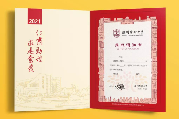 通知书被温医大十一所学院的核心元素环绕着:有“小白宫”美誉的图书馆、“藏”着科研宝藏的生物科研大楼……