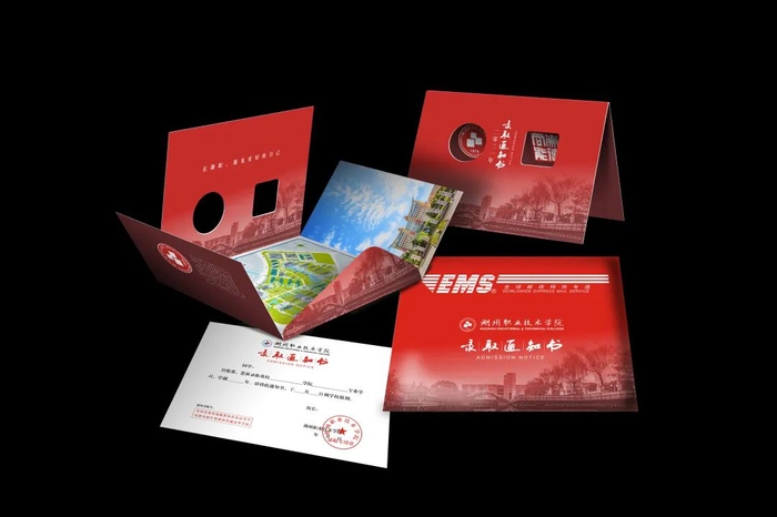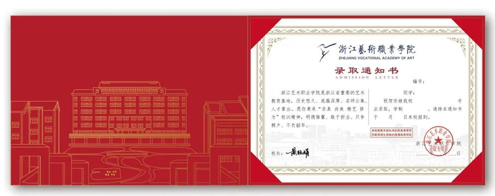 浙江水利水电学院的录取通知书整体造型参照荣誉证书样式,以“大红本”寓意大学第一本证书。
