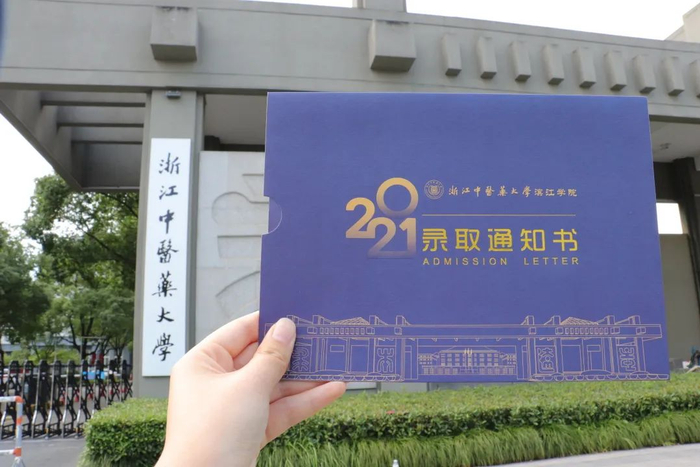 特制的专递封面诉说着学校对新生的欢迎,磨砂渐变的“2021”,烫金质感的“录取通知书”大字,标志着新生未来的勇敢蜕变。浙江中医药大学的录取通知书将于7月20日左右派发。