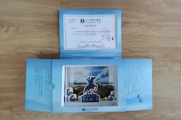 浙江警察学院的录取通知书以蓝色为底色。左为录取通知书,右为浙警忠诚铭,寄来了喜悦,更寄来了责任。