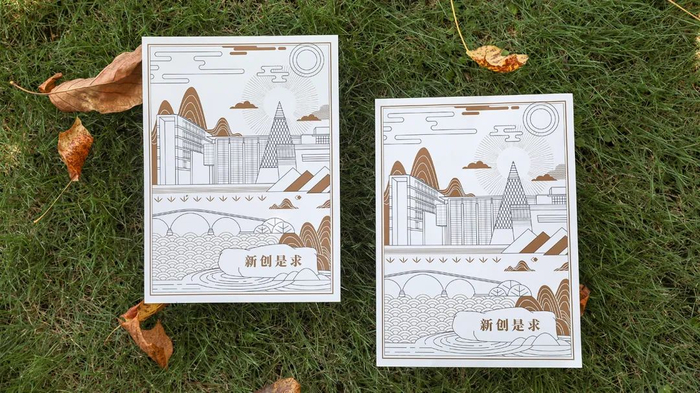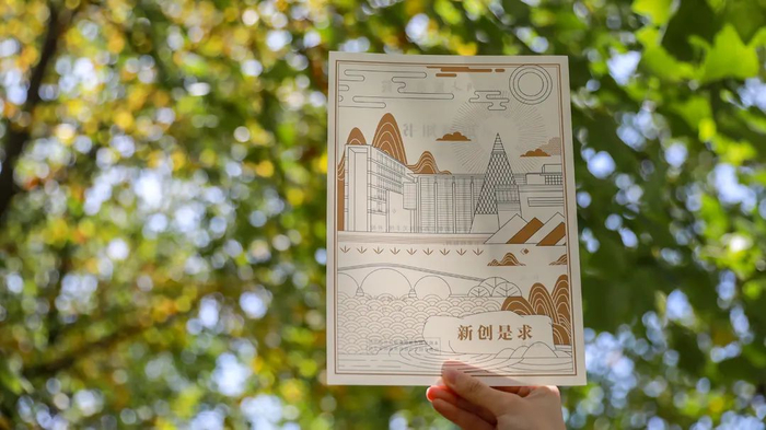 打开录取通知书外壳,映入眼帘的是立体镂空设计的“修德求真”校训。底部的校园风景手绘线稿,不仅融合了绍兴江南水乡的城市风貌,还全面展示了学校的建筑风格和特色,让新生对未来四年的求学环境有直观感受。