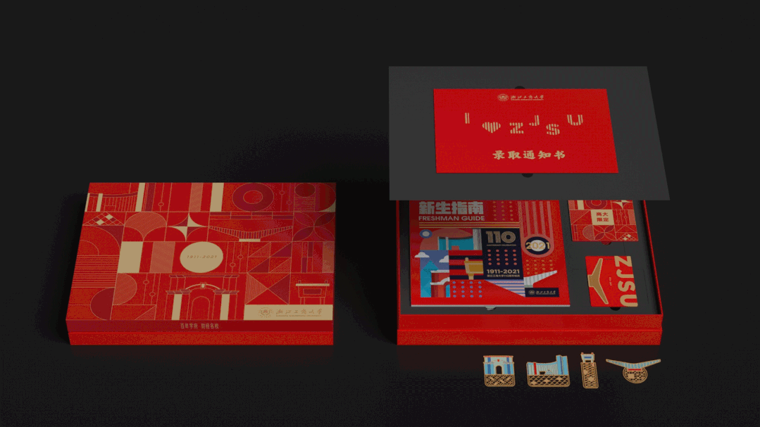 110周年纪念版录取通知书围绕校庆主题,展现浙江工商大学的历史底蕴和人文情怀。另有惊喜满满的纪念卡套和限定盲盒,盲盒内含四款标志性建筑的徽章,每位新生将随机收到一款。