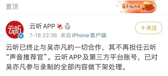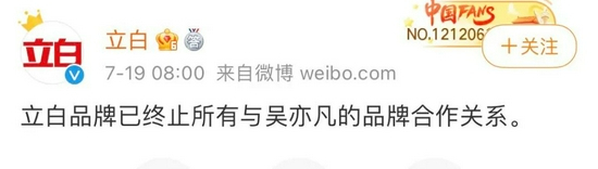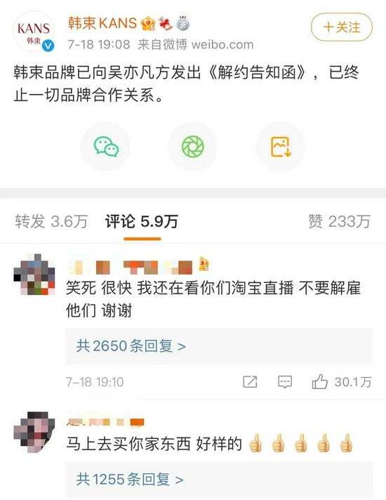 除韩束外,云听、立白、滋源、腾讯视频等品牌也宣布与吴亦凡终止合作关系,良品铺子、康师傅冰红茶、王者荣耀、华帝、保时捷等品牌则纷纷隐藏了与吴亦凡相关的微博。据正观新闻梳理,截至目前,吴亦凡的内地商务合作已全部解约。