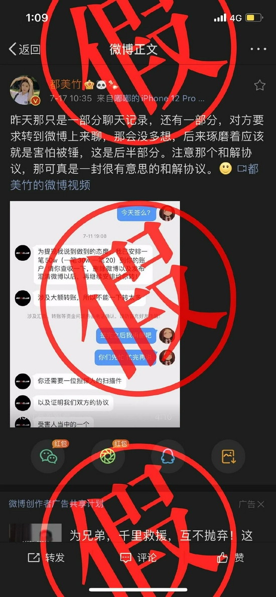 ·吴亦凡工作室称都美竹晒出的聊天记录是伪造的。图自吴亦凡工作室微博。
