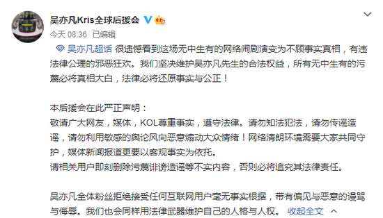 “很遗憾看到这场无中生有的网络闹剧演变为不顾事实真相,有违法律公理的邪恶狂欢。我们坚决维护吴亦凡先生的合法权益,所有无中生有的污蔑必将真相大白,法律必将还原事实与公正!”后援会微博如是说。