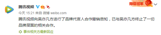 ·腾讯视频、立白、云听等多个品牌宣布与吴亦凡解约。图自微博。