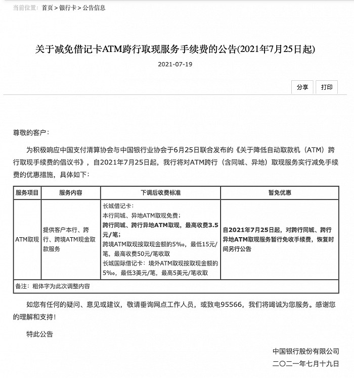 中国银行7月19日在其官网发布公告称,自2021年7月25日起,对跨行同城、跨行异地ATM取现服务暂行免收手续费。