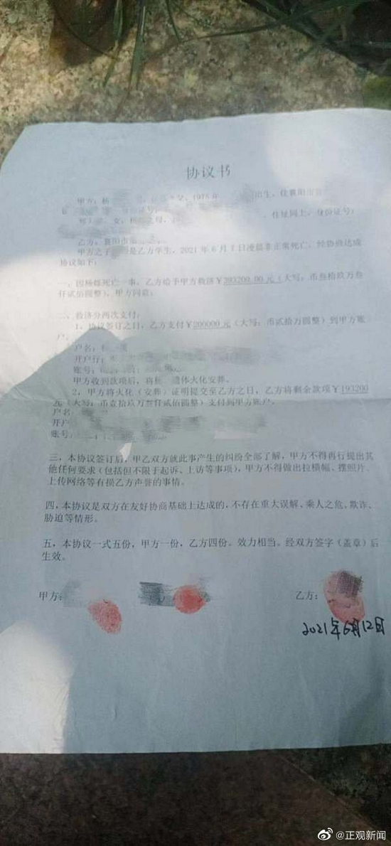 协议内容显示,甲方为杨先生夫妻二人,乙方为襄阳市某中学。协议签订之日,乙方向甲方支付20万元,甲方将杨某遗体火化,并证明提交之后,乙方支付剩余193200元,此外甲方不得提出其他要求,做出有损乙方名誉的事情。
