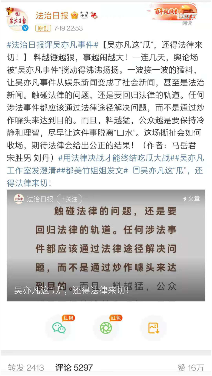 此外,《法制日报》还写道,“娱乐圈不是法外之地,明星艺人如若触犯法律自有法律严惩,在不触碰法律底线的基础上,如若违背公序良俗并造成恶劣影响,在公众心目中的人设也会瞬间崩塌。”