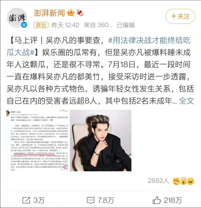 在@都美竹 指控吴亦凡“灌酒迷奸、诱奸多位未成年女生”的那一刻,“吴亦凡事件”就早已不是偶像艺人失德的娱乐丑闻,而是一场社会事件,甚至是刑事案件。